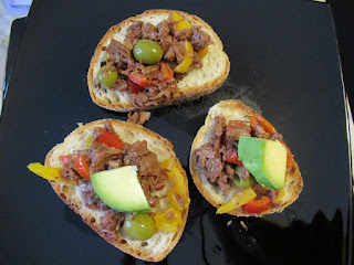 1/2 filone di pane, 1 confezione di polpa di jackfruit, 1 peperone rosso, 1 peperone giallo, olive, sale integrale, avocado, olio extravergine d’oliva, aglio.
