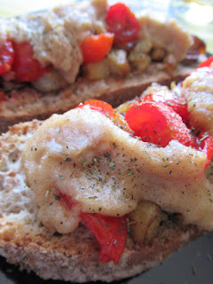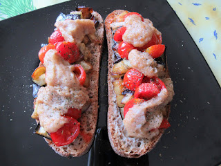 Cuocere la melanzana a cubetti in forno su una teglia con cartaforno per 25 minuti a 180°. Scottare i pomodorini in padella con un filo d’olio ed aggiungere le melanzane, aggiungere il sale e mescolare. Affettare il pane e distribuirvi le melanzane preparate, distribuendovi anche qualche cucchiaiata di formaggio di mandorle (ricetta qui). Spolverizzare con l’origano ed infornare a 190° per 10 minuti.