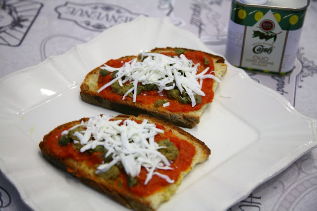 Accendere il forno a 180 gradi e quando raggiunge la temperatura inserire la teglia con le bruscette e lasciare scaldare per 5 o 6 minuti.