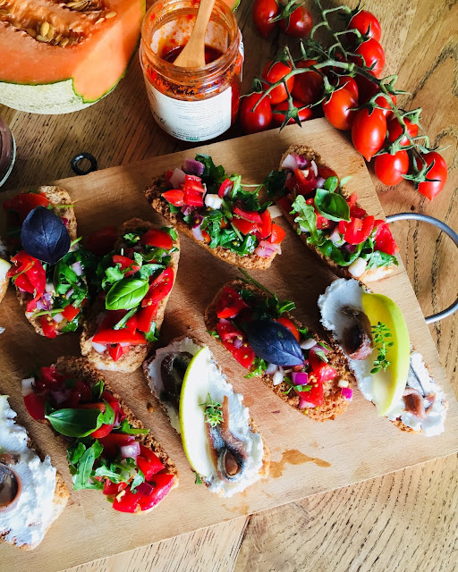 Dopo un susseguirsi infinito di giornate piovose, dove si alternano sole e pioggia in maniera disorientante, dove si passa dai 12 gradi ai 28 in un battibaleno, ieri sera nel sentire un po’ di tepore e nel vedere che il cielo si stava schiarendo…ecco che ho sfoggiato subito le mie bruschette e tagliato un bel melone, maturo al punto giusto!