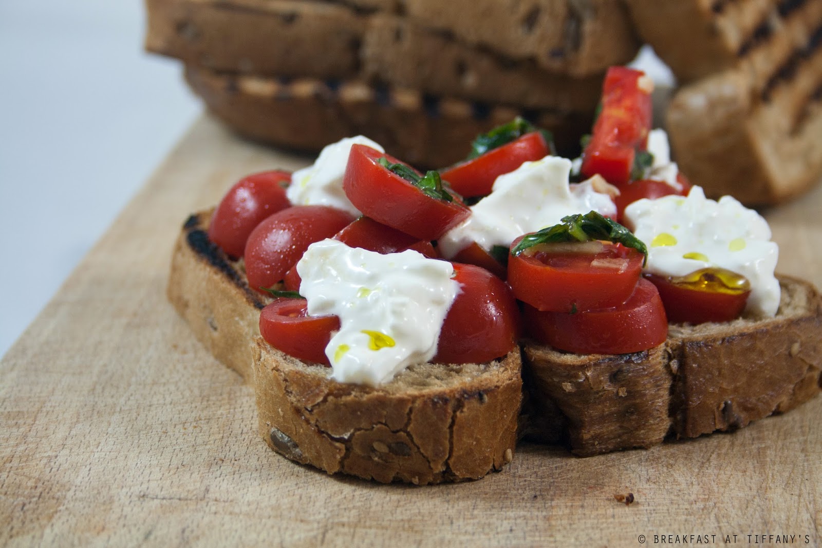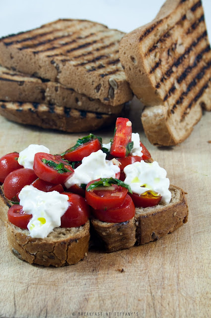 Adagiare sopra ogni fetta di pane i pomodorini e la burrata e a piacere aggiungere un altro goccio di olio d’oliva.