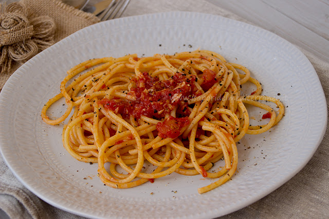 In una pentola con acqua salata cuocete i bucatini, e due minuti prima della fine di cottura versateli nel sugo di aglio e completare la cottura. Lasciate riposare la pasta per due minuti, servite guarnendo con del pepe macinato al momento.