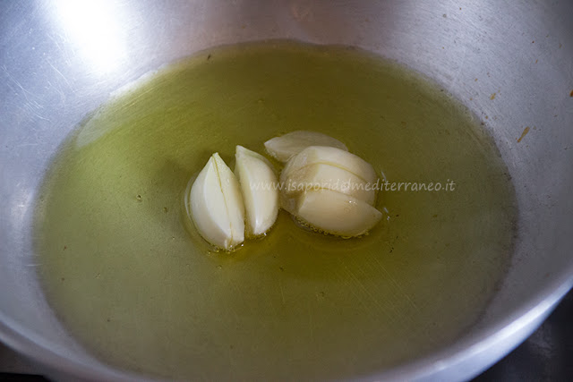 Sbucciate gli spicchi di aglio e tagliateli in due parti. In una padella mettete l’olio extra vergine di oliva e gli spicchi d’aglio; posizionate la padella sul fornello del caffè a fiamma molto bassa.