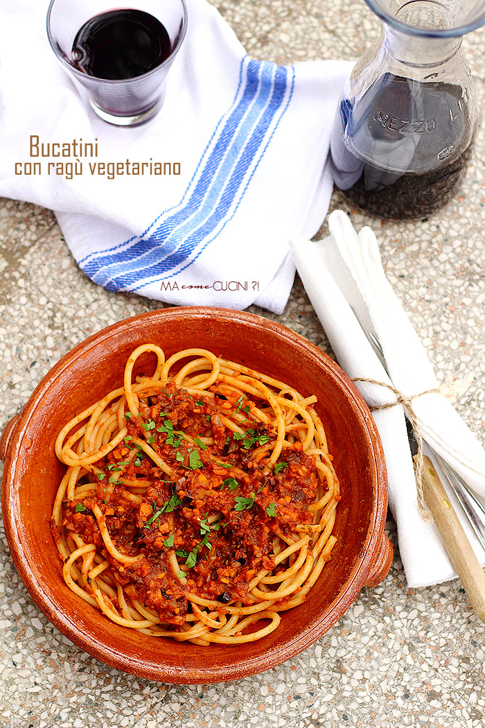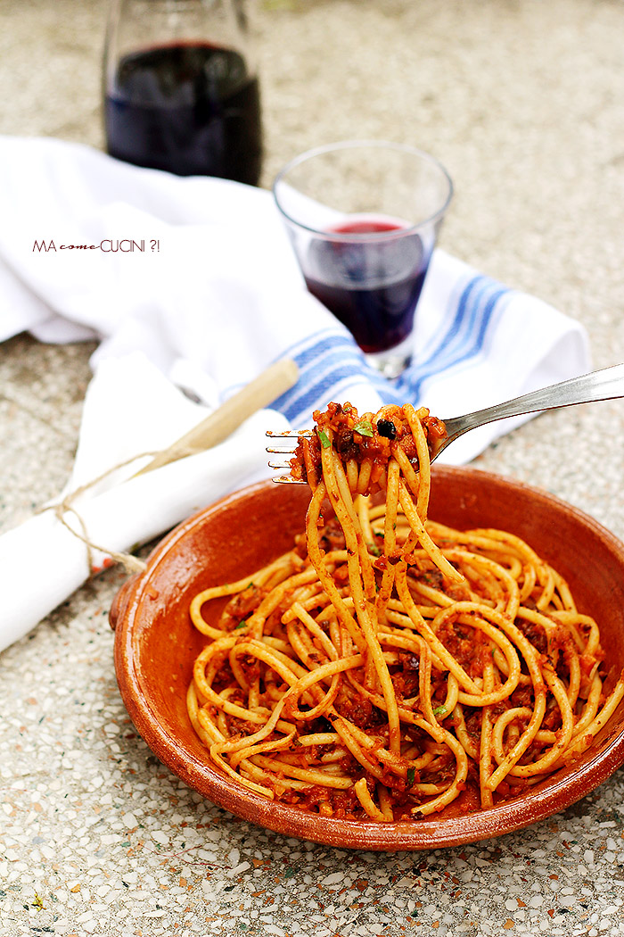 Cuocete i bucatini in abbondante acqua salata, scolateli al dente (forse la mia pasta non sembra molto al dente ma ha dovuto attendere i tempi degli scatti!) tenendo da parte un po’ d’acqua di cottura e versateli in padella con il sugo.