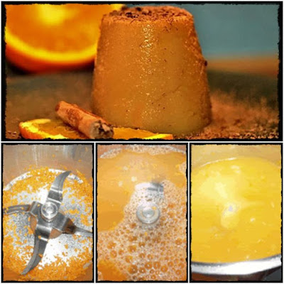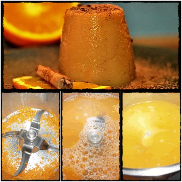 Tritare la buccia d’arancia 10 sec. vel. 8, raccogliere il trito con la spatola e ancora 10 sec. vel.8. Aggiungere lo zucchero; 15 Sec.Vel.10. Spremere con lo spremiagrumi le arance ed inserire il succo nel boccale. Aggiungere gli altri ingredienti e l’acqua, mescolare 10 sec., vel.4. Impostare la temperatura a 100°, vel.2, 10 min. Versare nei contenitori per budini o in unico stampo, fate raffreddare a temperatura ambiente. Passate in frigorifero per un paio d’ore. Rovesciate i budini dagli stampini su un piatto, spolverate con cannella e se piace anche con del cioccolato fondente grattugiato e a scaglie, guarnite con una fetta d’arancia e cannella.