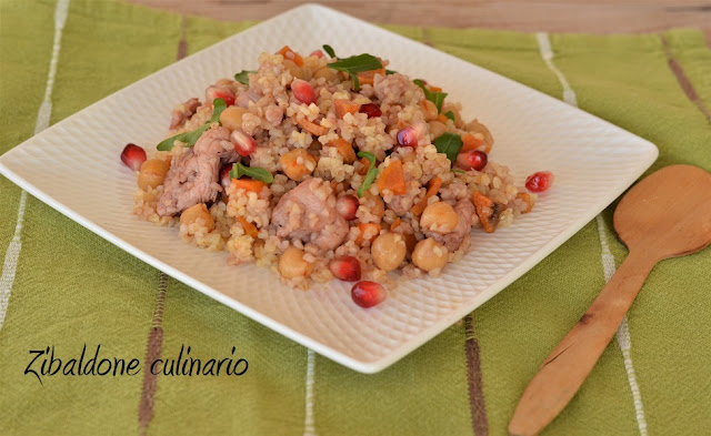 Unire al bulgur, sia le patate dolci che i ceci. Ora si passa al pollo, che dopo averlo tagliato a cubetti di circa 2cm di lato, si salta velocemente in padella con un poco di olio, dopo averlo rosolato da tutti i lati, aggiustare di sale e aggiungere un cucchiaio grande di melassa di melagrana, mescolare accuratamente.