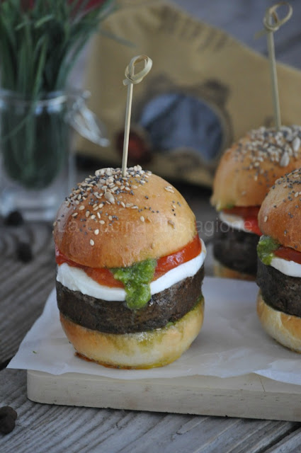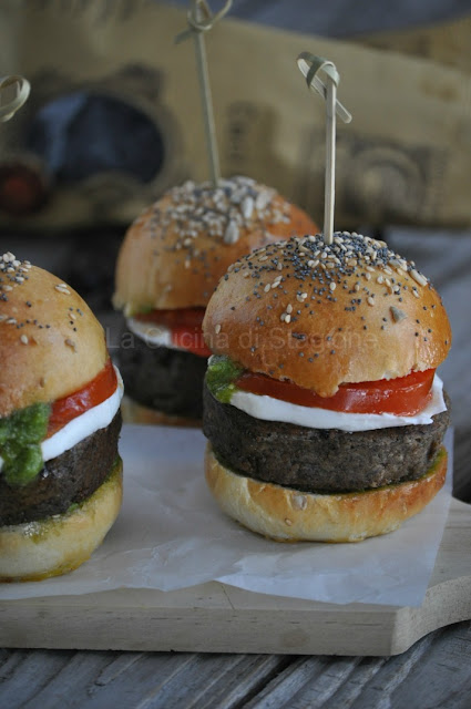 Per i buns: sciogliete il lievito nel latte tiepido. Unite il malto. In planetaria versate la farina setacciata. Versate lentamente il latte lavorando l’impasto. Unite l’olio e lo zucchero e infine il sale. Impastate poi sulla spianatoria fino ad ottenere un impasto liscio e setoso. Lasciatelo riposare fino al raddoppio (circa 3 ore) in una ciotola coperta da pellicola. Trascorso il tempo, sgonfiate l’impasto e ripiegatelo su se stesso. Lasciatelo riposare per mezz’ora coperto da un panno. Formate dei panini del peso di 70 gr cad., adagiateli su una teglia con carta forno (foto 3). Fate riposare ancora per mezz’ora coperti da pellicola. Spennellate i panini con il tuorlo e il latte mischiati. Infornateli per circa 25 minuti a 180°. Formate i burger dello stesso diametro dei panini utilizzando un coppa pasta (foto 2). Rosolateli da entrambi i lati in olio evo ben caldo. Tagliate i pomodori a fette alte 1 cm. Arrostiteli nello nello olio dei burger pochi minuti per lato. Spalmate i panini con pesto da entrambi i lati e farciteli con i burger, i pomodori e la bufala fresca.