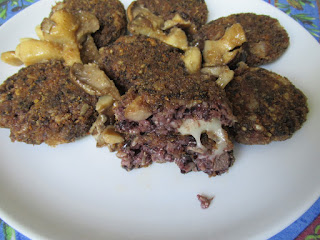 Pulire i funghi e tagliarli a pezzetti, scaldare un filo d’olio con lo spicchio d’aglio ed aggiungere i funghi. Farli cuocere una decina di minuti a fiamma media, mescolando di tanto in tanto. Nel frattempo lessare il riso per 45 minuti, eliminare l’acqua di cottura e frullarlo con il minipimer. Aggiungere una manciata di funghi al riso e frullare ancora. Aggiungere il sale sia al riso che ai funghi. Aggiungere i semi ed un paio di fette di formaggio a cubetti e mescolare. Ottenere dei burger passandoli nel pangrattato. Il pangrattato che è avanzato l’ho aggiunto ai funghi e fatto scurire un po’ riaccendendo la fiamma per un paio di minuti. In padella antiaderente cuocere pochi minuti i burger con un filo d’olio, rigirare anche dall’altro lato e portare in tavola.