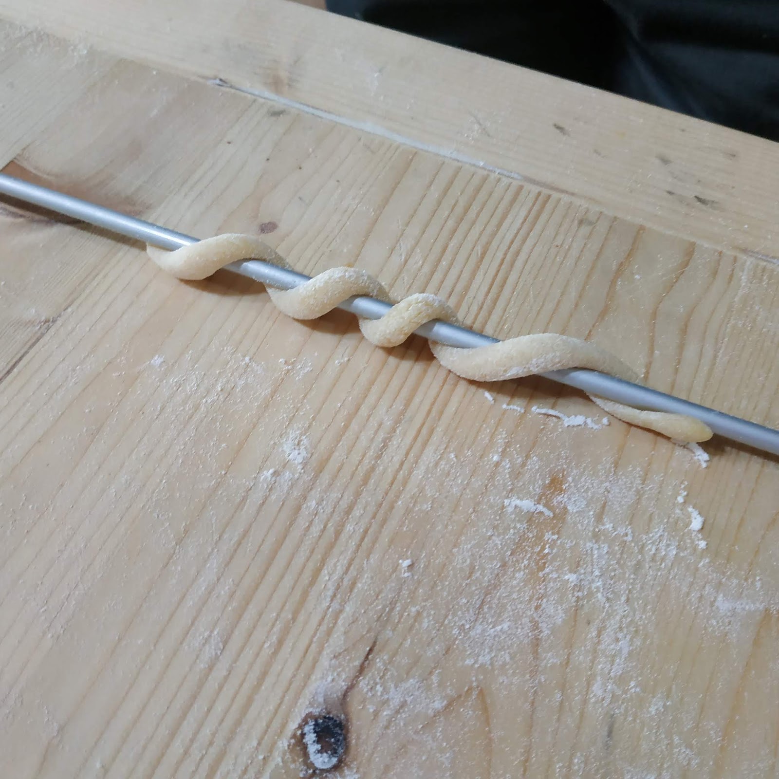 Ricavare dei rotolini sottili lavorando piccoli pezzi di pasta; tagliarli ad una lunghezza di 25 cm circa e arrotolarli al ferro.