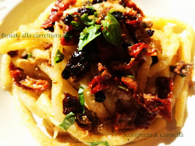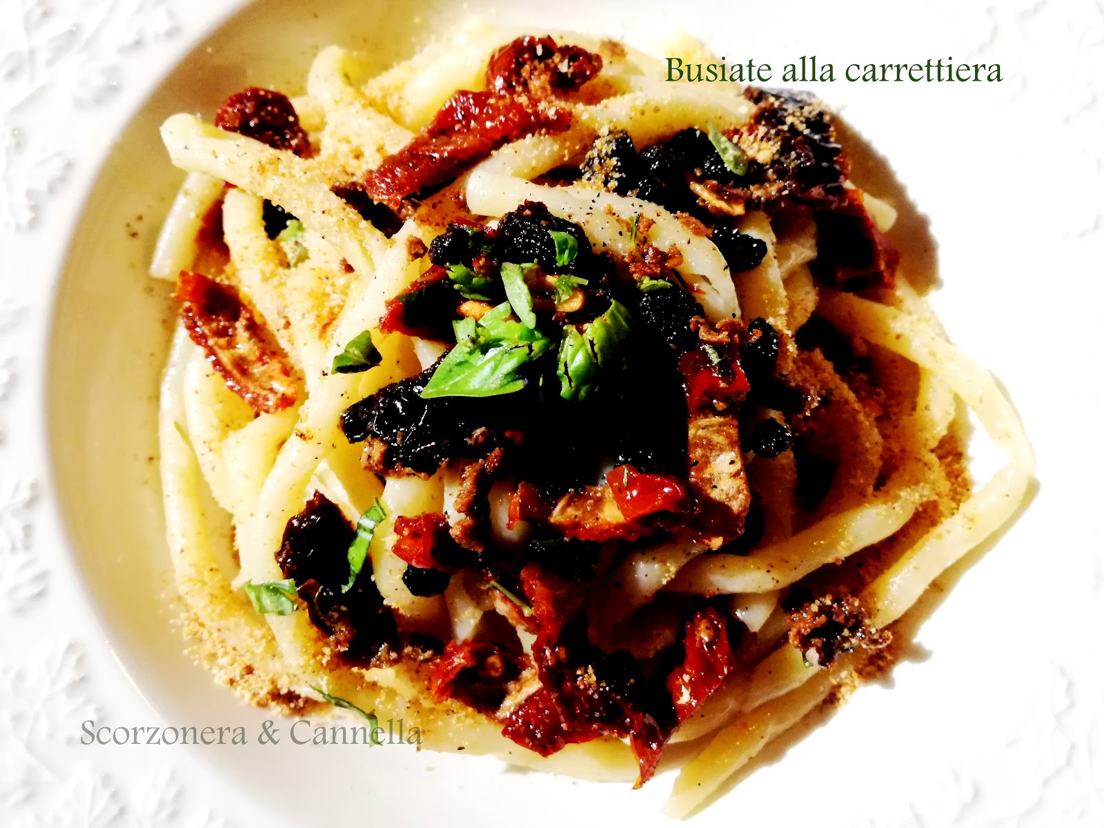 Ingredienti (per 4 persone): 600 gr. di busiate (sorta di piccolo fusillo lungo, tipico del trapanese) o altro formato di pasta lunga che vi piaccia; 3 filetti d’acciuga; 10 pomodori secchi; 3 spicchi d’aglio; 1 cucchiaio di passolina; 25 gr. di bottarga di tonno; olio extravergine d’oliva; 4 cucchiai di muddica atturrata (pangrattato tostato); qualche fogliolina di basilico; sale e pepe nero.