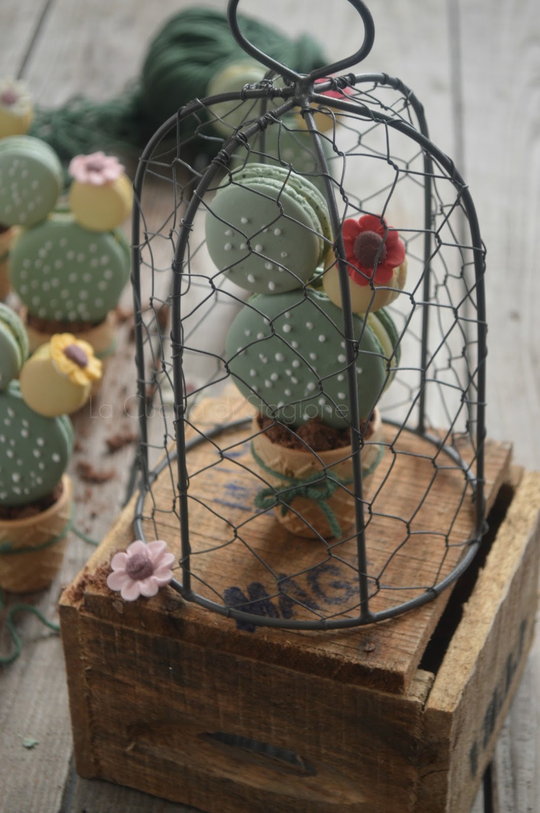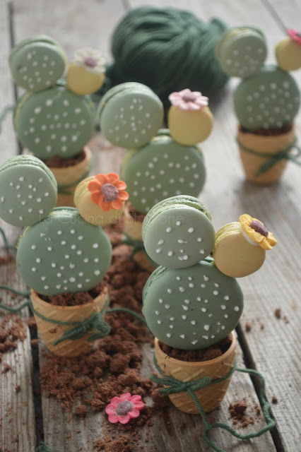 Per la ganache portare ad ebollizione la panna, aggiungete il cioccolato tritato e mescolate energicamente creando un’emulsione. Unite poi la pasta di pistacchio e riponete in frigorifero per almeno 3-4 ore. Unite i due biscotti riempiendoli di abbondante farcitura (foto 2). Con la ghiaccia reale ed un conetto di carta da forno, formate le spine. Riempite i bicchierini di cialda con il crumble al cacao, compattandolo bene. Montate i cactus, unendoli tra loro con la ghiaccia reale e con quale stuzzicadenti. Decorate con fiorellini di zucchero (foto 3).