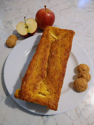 Tritate grossolanamente gli amaretti e aggiungeteli all’impasto, sbucciate la mela la tagliatela a