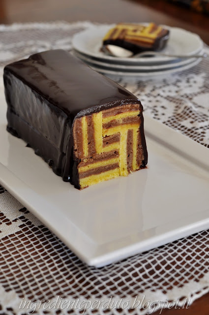 Le sezioni non saranno perfettamente uguali, io per ricostruire il dolce ho inserito al centro una striscia di dolce lunga e stretta, voi regolatevi come meglio credete considerando anche il disegno che volete ottenere.