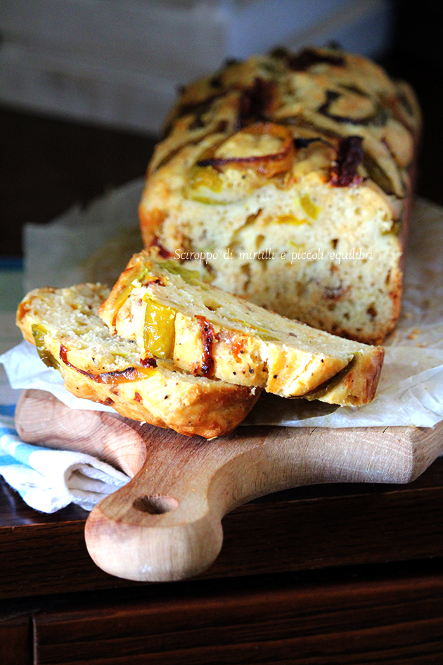 Si versa il composto in uno stampo da plumcake ricoperto di carta da forno. Sulla superficie si adagiano le strisce di peperone e di pomodori secchi.
