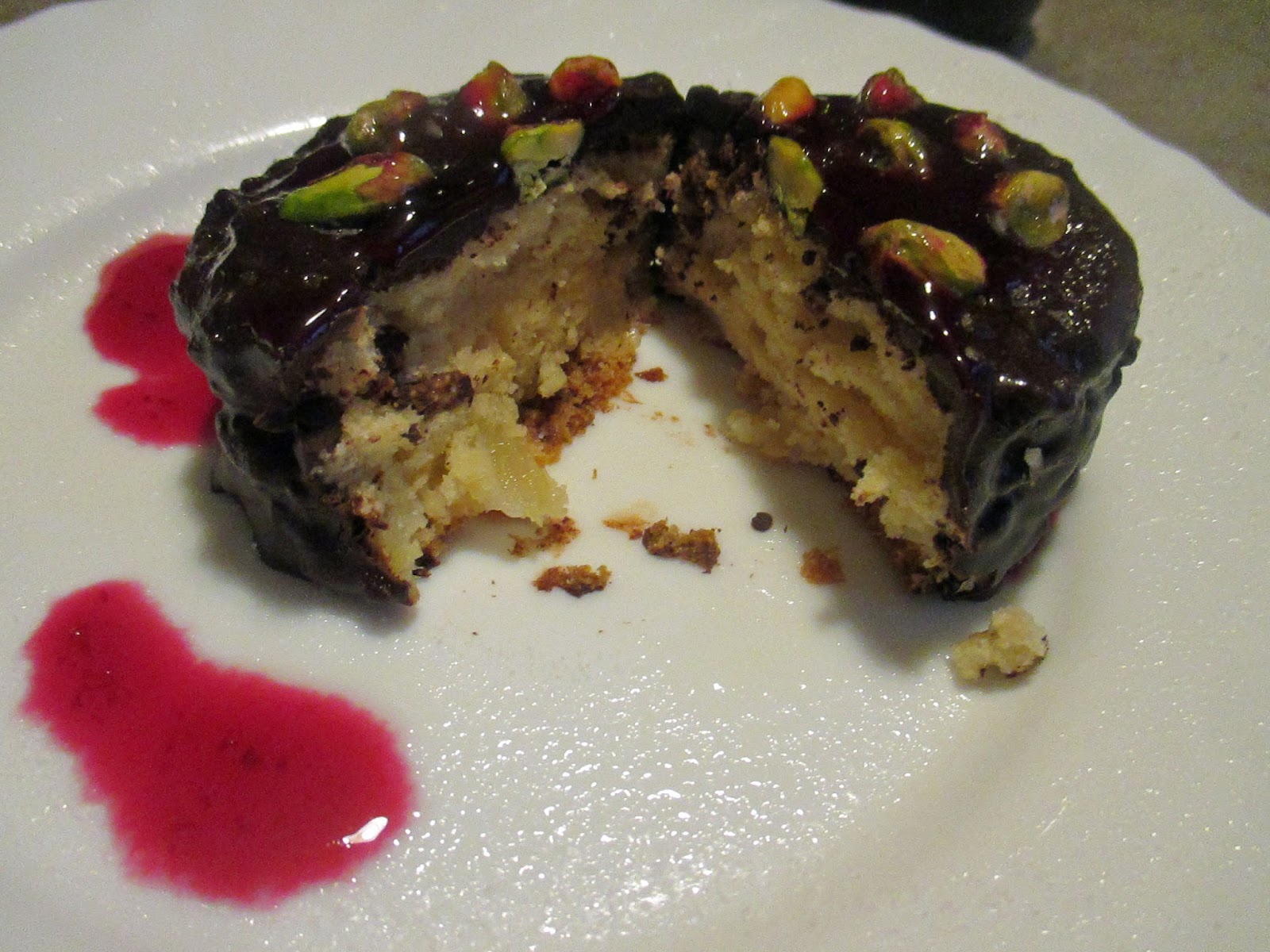 Beat the egg whites until stiff and add to the mixture, stirring gently from bottom to top. Finally add the pears cut into thin pieces and chopped pistachios purposes.