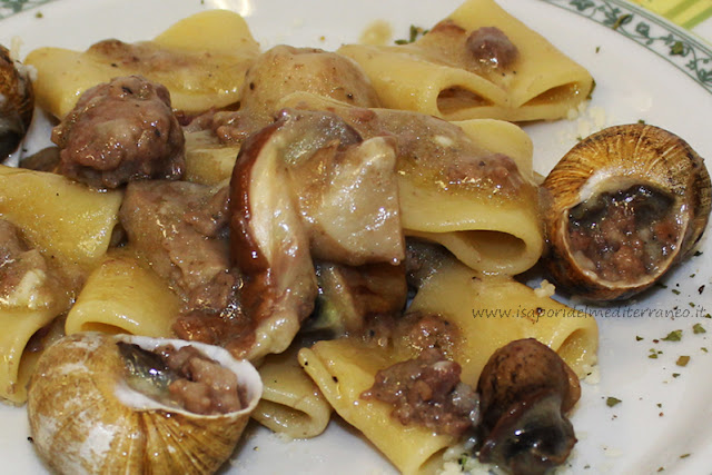 Prima operazione e quella di precuocere le lumache. Assicurarsi dal venditore che le lumache sono già purgate, altrimenti farle digiunare 5-6 giorni in un secchio coperto da tenere in cantina. Questo tempo permette di eliminare i residui di erbe con cattivo sapore che hanno mangiato. Dopodichè le lumache vanno lavate con acqua e il 20% di aceto ripetutamente per eliminare la bava. Vanno messe poi sul fuoco in acqua fredda; quando l’acqua si scalda le lumache escono dal guscio fino poi a morire. Fate bollire per 7-10 minuti, scolate e lasciarle raffreddare. Dopo di ciò estrarre la lumaca dal guscio ed eliminare la parte finale (intestino). Pulite i funghi porcini, strofinateli delicatamente con un telo bagnato; tagliare i funghi a fette piuttosto grandi. In un tegame con l’olio extra vergine di oliva, fate soffriggere a fuoco lentissimo l’aglio schiacciato; poi aggiungere i funghi porcini, la salsiccia fresca sminuzzata e le lumache private del loro guscio. Lasciate cuocere a fuoco moderato per 7-10 minuti, bagnando se necessario con poco acqua. Lessate la calamarata in abbondante acqua salata, scolatela al dente e saltatela nel sugo di porcini, lumache e salsiccia e poco parmigiano. Fate riposare la pasta per circa 2 minuti. Impiattate e gusterete un abbinamento di terra davvero fantastico.