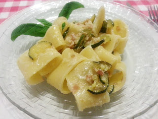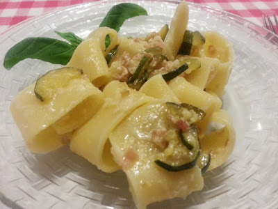 400 gr di pasta tipo calamarata, 3 zucchine medie, 60-70 gr di rigatino a fettine, 80 gr di parmigiano, 1 scalogno, olio, sale, pepe.