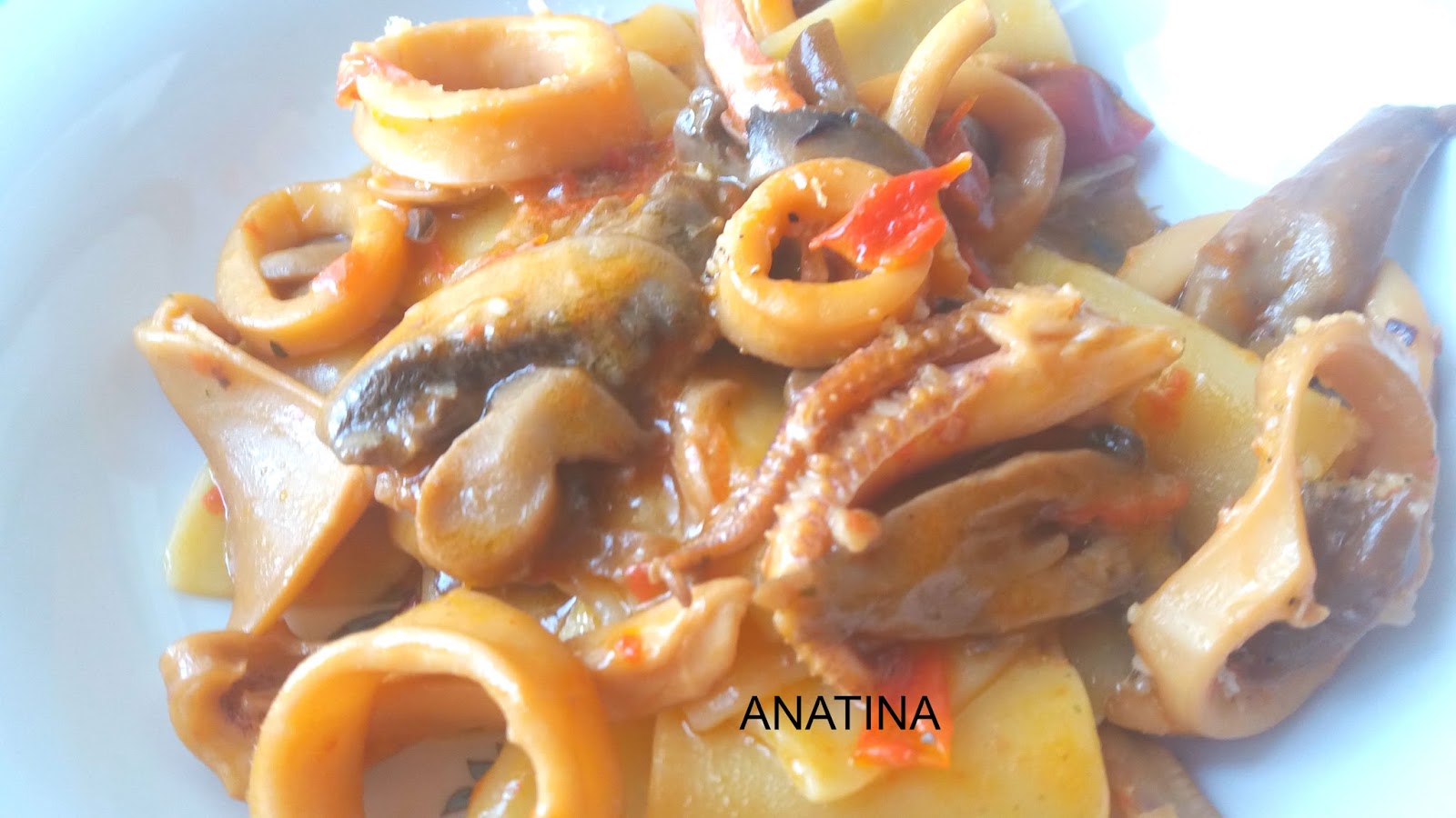 qualche fungo,farli rosolare e sfumare con il vino ,aggiungere i pomodorini,il restante calamaro,