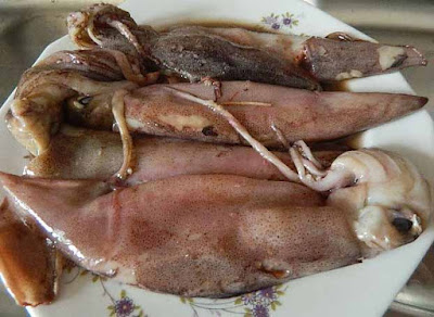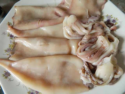 sciacquare i calamari sotto l’acqua corrente, staccare la testa dal mantello, estrarre la cartilagine trasparente che si trova nel mantello.