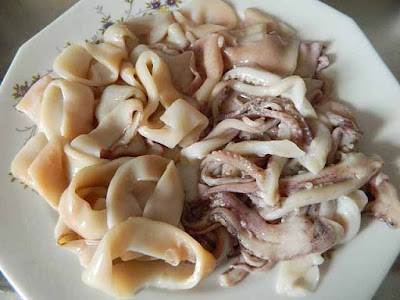 Ora tagliare i calamari ad anelli e dividere i tentacoli della testa.