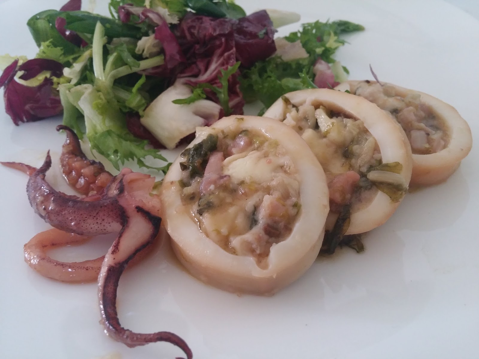 Mettere a bagno la mollica. Quando sarà morbida strizzatela per eliminare tutta l’acqua e tenetela da parte. Lavare e tagliare la scarola. Fare un leggero soffritto con aglio, olive e capperi. Unire la scarola e far stufare il tutto. Pulire i calamari separando le sacche dalle ali e dai tentacoli. Tritare le ali e cuocetele in padella a fuoco vivace per 3-4 minuti con un filo d’olio e un po di aglio. Unire la mollica di pane e far insaporire il tutto. Tagliare la provola a cubetti e trasferirla in una ciotola aggiungendo anche i calamari cotti con il pane e la scarola. Regolare di sale e pepe e amalgamare il tutto. Riempire con il composto le sacche del calamaro per 3/4 chiudendole con uno stuzzicadenti e cuocetele in padella con un filo d’olio ed uno spicchio di aglio. Far rosolare, quindi sfumare con il vino. Lasciar cuocere per 10 minuti. Tagliare il calamaro a fette e servite.