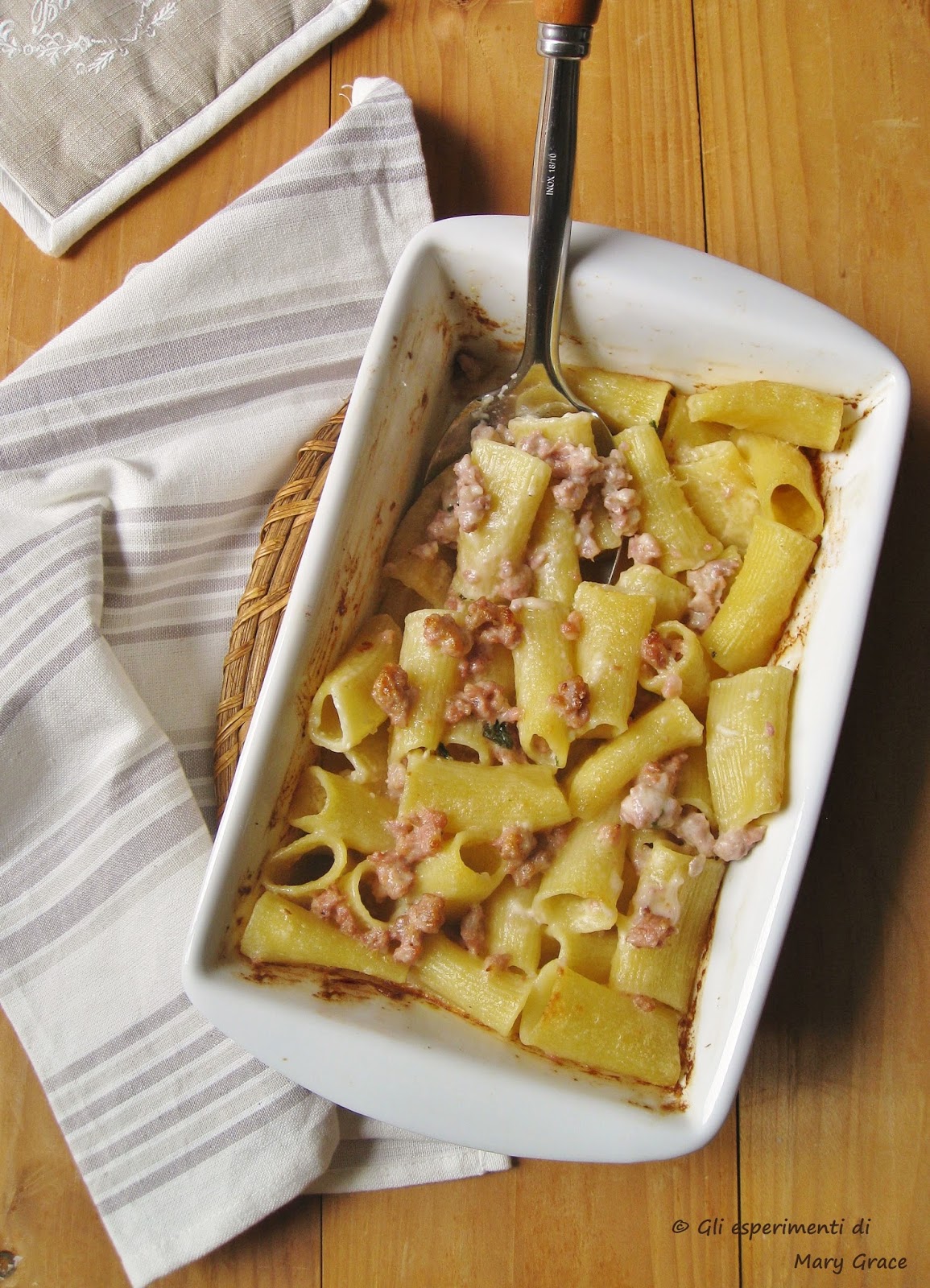 Il mio omaggio arriva attraverso il saporito condimento di un profumatissima pasta al forno, nella quale l’insaccato si accompagna ad una gustosa ma non prevaricante robiola di Roccaverano Dop.