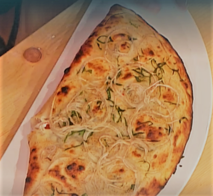 A lievitazione avvenuta (dopo circa 8 ore) stendere la pagnotta sui bordi posizionandola sulla retina coperta con carta da forno, mettere la ricotta a forma di mezza luna, la verdura, la provola affumicata, i pomodorini e la pancetta pepata.