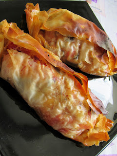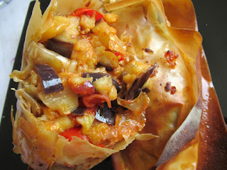 Lasciar scongelare la pasta fillo per 2 ore. Nel frattempo tagliare le melanzane a cubetti con tutta la buccia. Se si ha tempo lasciarle un po’ spolverizzate di sale in una scodella e poi risciacquarle sotto l’acqua corrente e strizzarle. Friggerle e lasciarle su un foglio di carta da cucina per far perdere un po’ di olio in eccesso. Nel frattempo in un’altra padella far dorare un po’ di cipolla con l’olio ed aggiungere i pomodorini tagliati a tocchetti. Dopo qualche minuto aggiungere le melanzane, mescolare e far cuocere altri 5 minuti, aggiungere sale ed origano e farcire le sfoglie di pasta fillo (due alla volta insieme perchè il ripieno è corposo e si otterrà anche un effetto millefoglie), richiudere a caramella ed informare per 15 minuti a 180°.