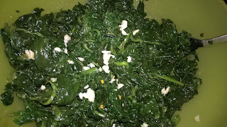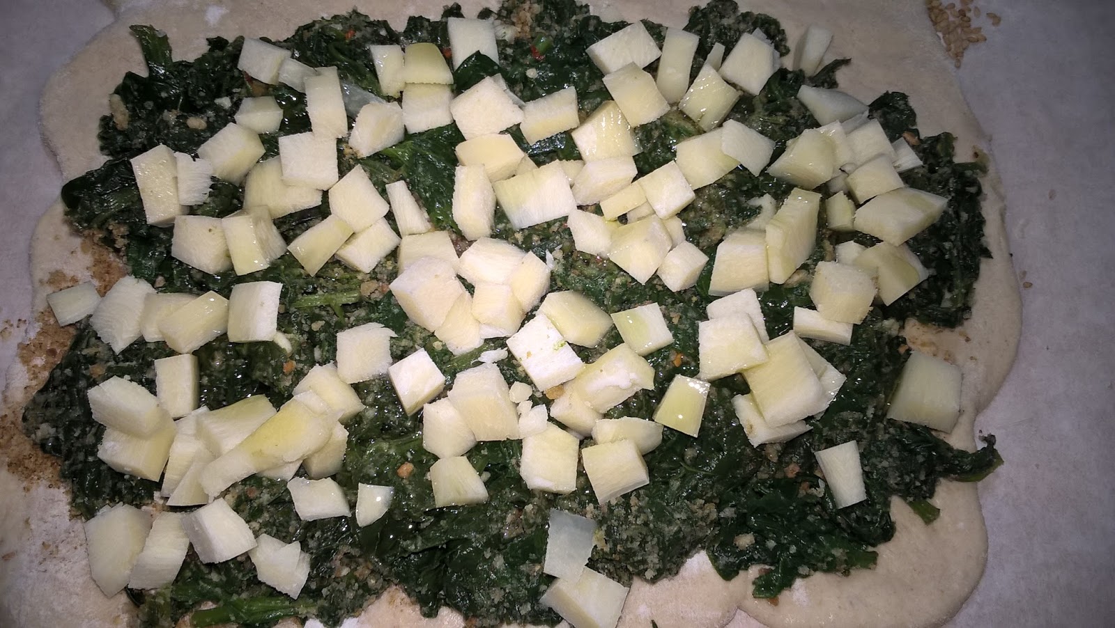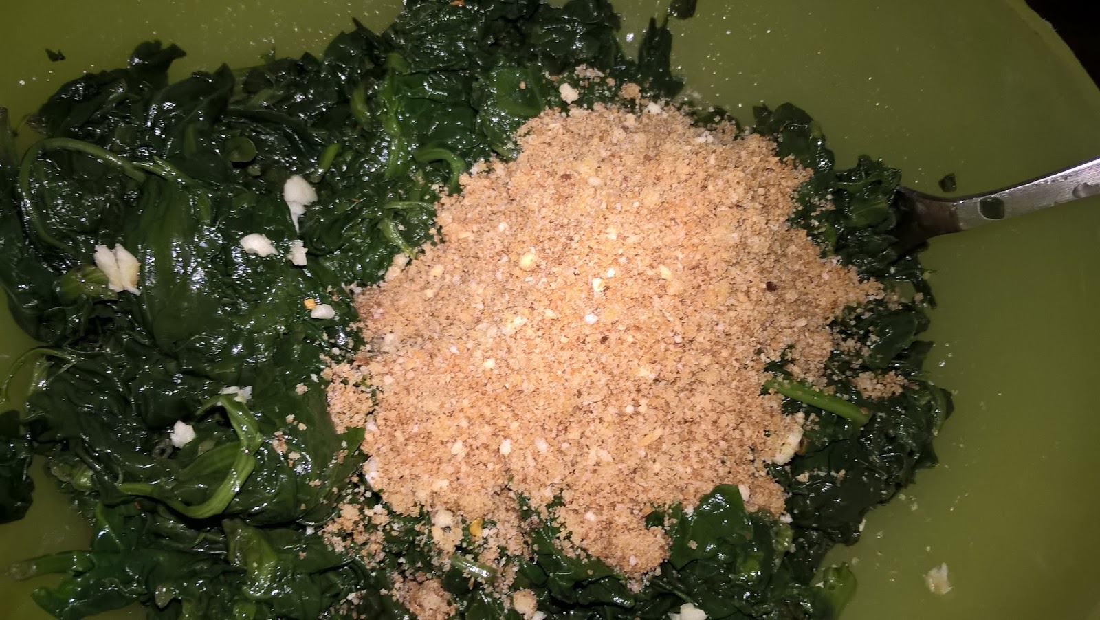 Intanto prepariamo il ripieno con 500 g di spinaci lessati e strizzati, pangrattato tostato, uva passa, pinoli, 100 g di formaggio morbido tipo provola, due spicchi d’aglio, olio extravergine d’oliva.