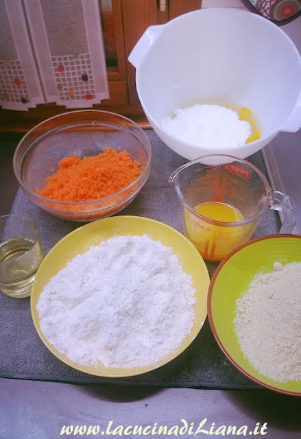 Montate le uova con lo zucchero, unite la farina di mandorle, aggiungete la buccia d’arancia ed unite un pizzico di sale. Incorporate le carote frullate e, sempre mescolando, aggiungete infine la farina precedentemente setacciata con il lievito.