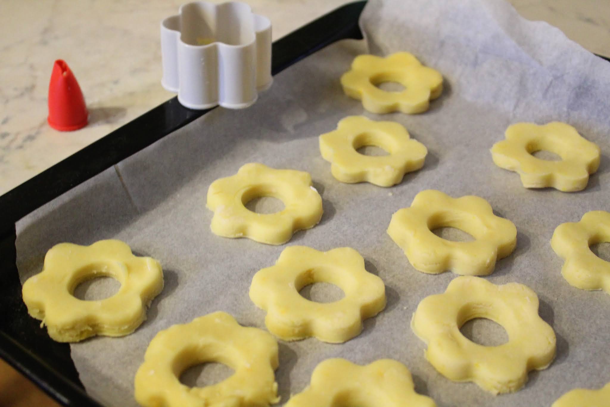Ritagliare i canestrelli utilizzando uno stampo a fiore con diametro di quattro centimetri; il foro centrale lo otterrete usando la punta di una sac a poche.