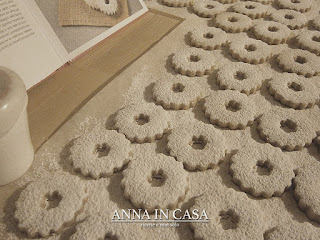 Infornare e cuocere fino a doratura. Sfornare e lasciare raffreddare i biscotti prima di cospargerli di zucchero a velo e di riporli in una biscottiera di latta.