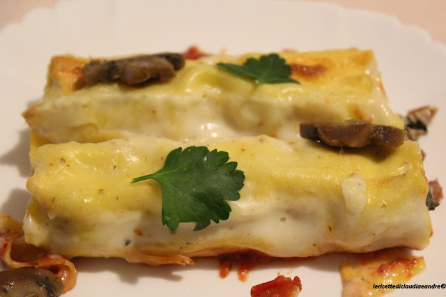- Stendere ogni metà della sfoglia, mettere 1-2 cucchiai di composto nel lato più stretto e arrotolare su se stesso per dare la forma ai cannelloni.