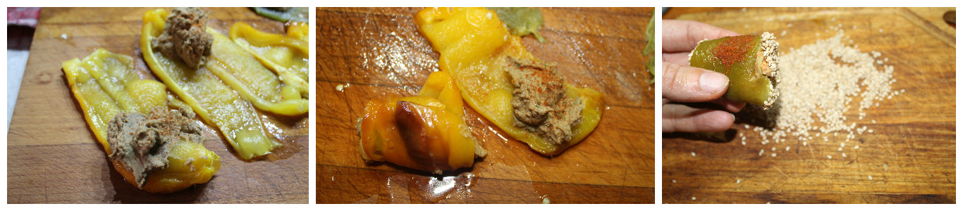 Farcite ora ogni filetto di peperone con un cucchiaio di crema, arrotolate formando dei cannoli; intingete ogni estremità dei rotolini nei semi di sesamo e disponeteli su un piatto da portata.