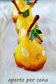 per la cottura – 4 piccole pere della varietà carmen, 150gr di Porto bianco, 4 cucchiai di Cointreau, 200gr di acqua, 2 cucchiai di zucchero di canna, scorza grattata di 1/2 limone e di 1/2 arancia, un pizzico di cannella, un abbondante pizzico di curcuma.
