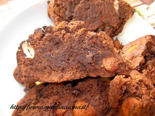 280 gr farina integrale di farro, 50 gr cacao amaro, 4 gr cremortartaro, 80 gr zucchero integrale di canna, 90 gr olio, 1 banana, 100 gr mandorle, 50 gr cioccolato fondente, 80 gr acqua, 2 datteri medjoul.