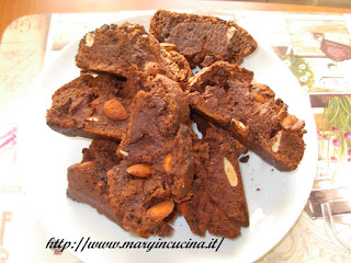 Frullare datteri e banana ed unire all’acqua e all’olio. Aggiungere tutte le polveri ed amalgamare bene. Aggiungere altra acqua se serve. Tagliare il cioccolato finemente ed aggiungerla all’impasto con le mandorle. Ottenere un tronchetto su una teglia con cartaforno. Cuocere a 180° per 20 minuti. Lasciar raffreddare, tagliare in fette e ripassarle in forno per farle biscottare a 150° per 10 minuti.
