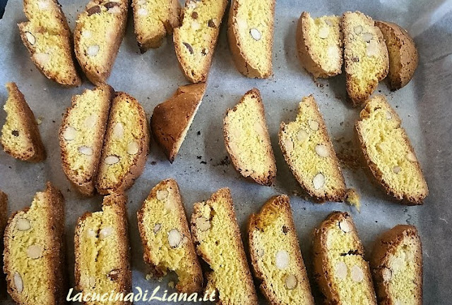Sfornarli e affettarli obliquamente, quindi disporre i cantucci sulla leccarda, e infornare a 200° ventilato per ulteriori 5 minuti.