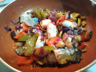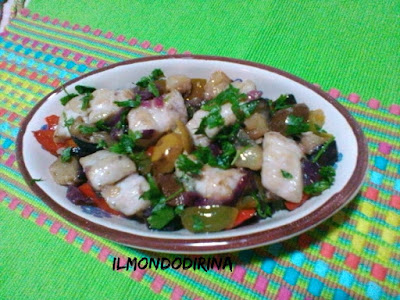 Pulite il pesce capone e togliete la lisca centrale e la testa. Ricavate dalla polpa dei filetti che taglierete poi a cubetti. Fateli arrostire in una padella antiaderente e metteteli da parte. Lavate le verdure e tagliatele. Le melanzane con la buccia, una volta tagliate a cubetti, vanno lasciate sotto sale per almeno un’ora. Io per la verità uso le melanzane violette che sono più dolci e non abbisognano di questa operazione. In una padella capiente versate l’olio evo e fate friggere la cipolla, unite quindi la melanzana e i peperoni e mescolate. Incoperchiate e fate cuocere a fuoco basso per 15 minuti circa. Una volta che le verdure sono pronte unite le olive snocciolate e i capperi dissalati, regolate di sale e mescolate delicatamente. Fate evaporare l’eventuale acqua di vegetazione e aggiungete lo zucchero e l’aceto. Fate sfumare e poi mettete il pesce e fatelo insaporire con le verdure.