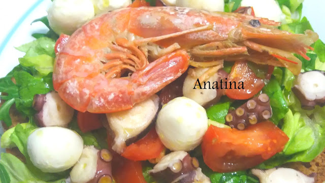una insalatina mista,pomodori pachino divisi in 4,polipo tagliato a pezzi grossi,bocconcini di