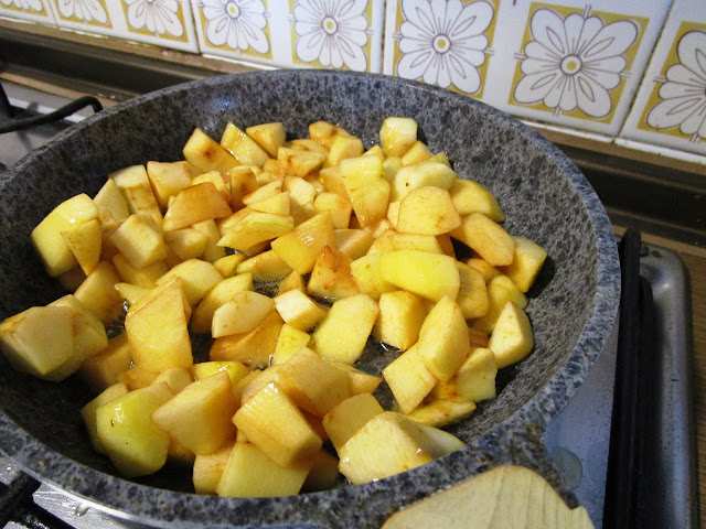 - aggiungere le mele fritte, mescolare molto delicatamente e cuocere, tutto insieme, per un minuto
