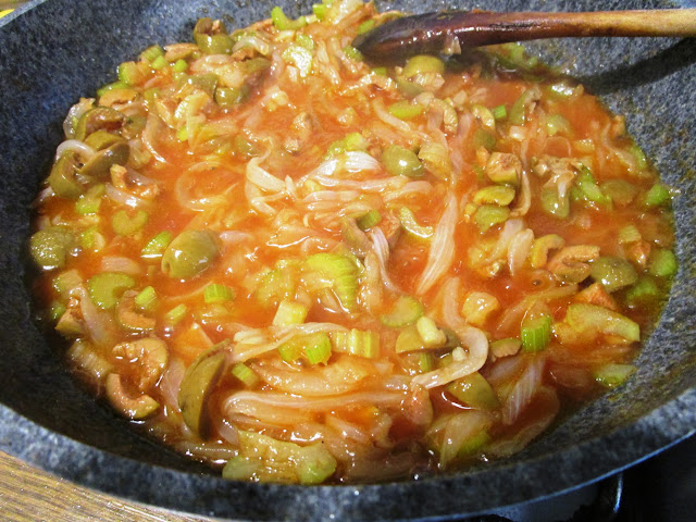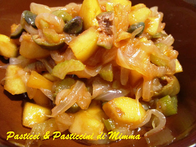 - nella larga padella con le cipolle già appassite, aggiungere il sedano lessato, i capperi, la salsa pronta, le olive e l’aceto con lo zucchero, aggiustare di sale e lasciare cuocere, a fuoco bassissimo, per un paio di minuti, mescolando