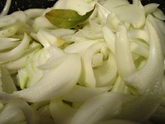 - mettere le cipolle in una larga padella e farle appassire con mezzo bicchiere di olio extravergine di oliva, a fuoco bassissimo e mescolando