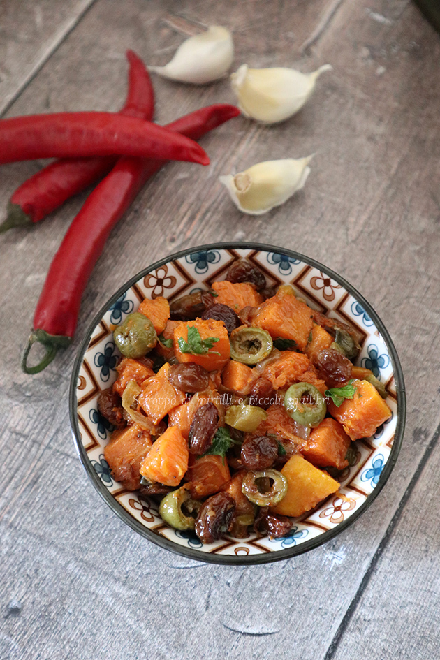 Ho una passione per le verdure in agrodolce. La caponata di melanzane e le sue varianti in estate sono sempre presenti nella mia tavola. Anche in autunno con la zucca si può avere un contorno molto gustoso. Dopo aver fritto dei dadi di zucca e messi da parte nella stessa padella ho cotto  il sedano e la cipolla, ho unito una miscela di zucchero e aceto bianco che regalano il tipico gusto agrodolce, poi uva passa, olive, capperi sotto sale infine la zucca fritta. Si fa insaporire il tutto. Fondamentale sarà il riposo per armonizzare i sapori.