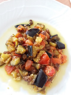 Rosolare, in una padella e a fuoco medio/basso, mezza cipolla rossa tritata; poi, quando quest’ultima diventa leggermente trasparente, aggiungere due melanzane (di medie dimensioni) tagliate a dadini, alzate di poco la fiamma e fate saltare il tutto, aggiungendo olio se necessario.