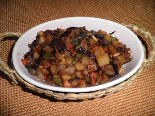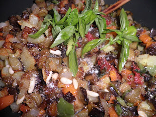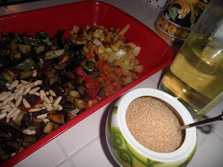 Quando saranno tutte pronte aggiungete i pinoli, l’uvetta e rimettete in padella. Fate insaporire il tutto mescolando insieme gli ingredienti; aggiungere un paio di cucchiai di passato di pomodoro, due cucchiai di zucchero (io uso quello di canna) e una bella spruzzata d’aceto. Fate evaporare e da ultimo completate con foglioline di basilico. Di solito va servita fredda, come contorno o come antipasto.