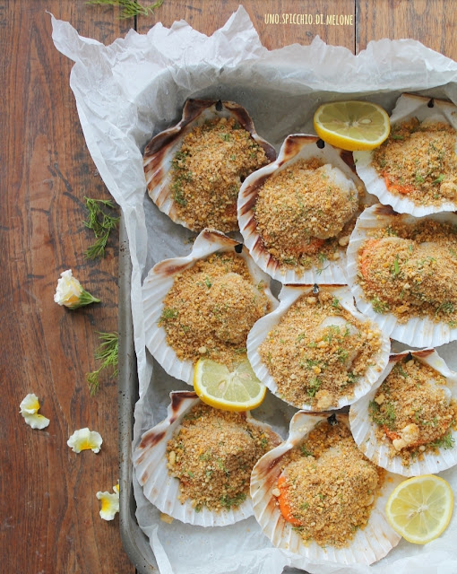 Infornate le vostre CAPPESANTE (forno preriscaldato) a 200/220°C per circa 15/20 minuti o per lo meno finchè non le vedete belle dorate.