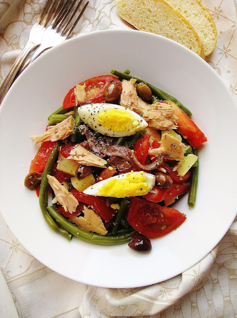 Le acciughe conservate sotto sale sono un elemento insostituibile dell’insalata ligure e pomodori freschi tagliati a fettine, capperi, olive taggiasche, olio extravergine di oliva e, eventualmente, uova sode, completano oggi un piatto davvero ottimo.