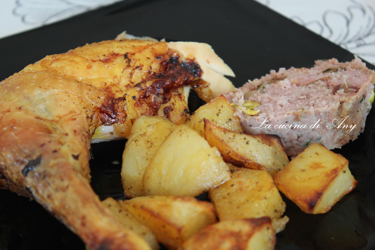 Noi abbiamo servito il cappone con il ripieno tagliato a fette e con delle patate al forno.