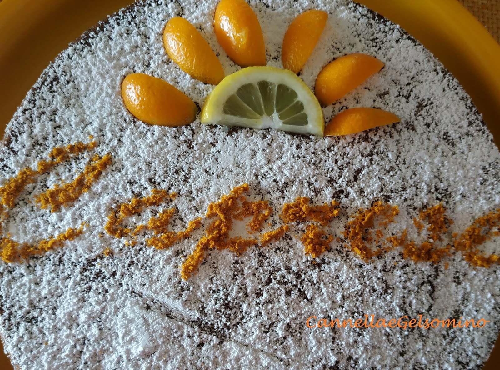 Ingredienti: 200 g di mandorle pelate oppure farina di mandorle, 180 g di zucchero, 100 g di olio extravergine, 180 g di cioccolato bianco, 5 uova, 50 g di farina di riso, buccia grattugiata di limone, 30 g di scorze candite, 1 cucchiaino di lievito per dolci, vaniglia,un bicchierino di limoncello, zucchero a velo per guarnire, polvere d’arancia.